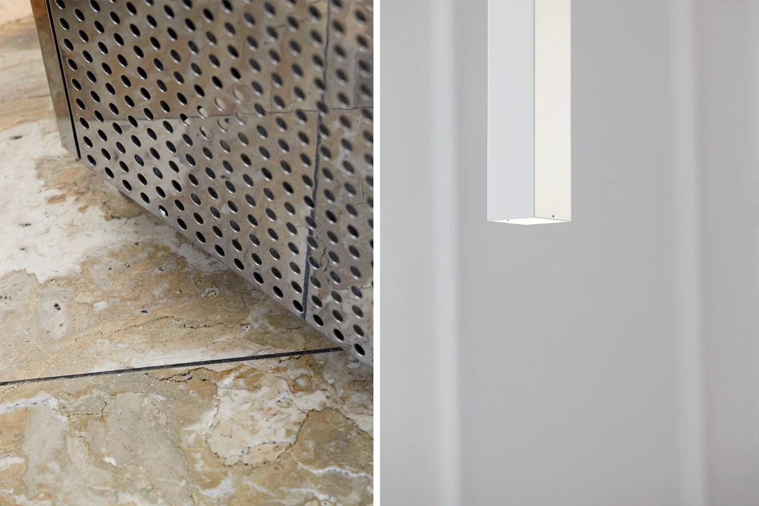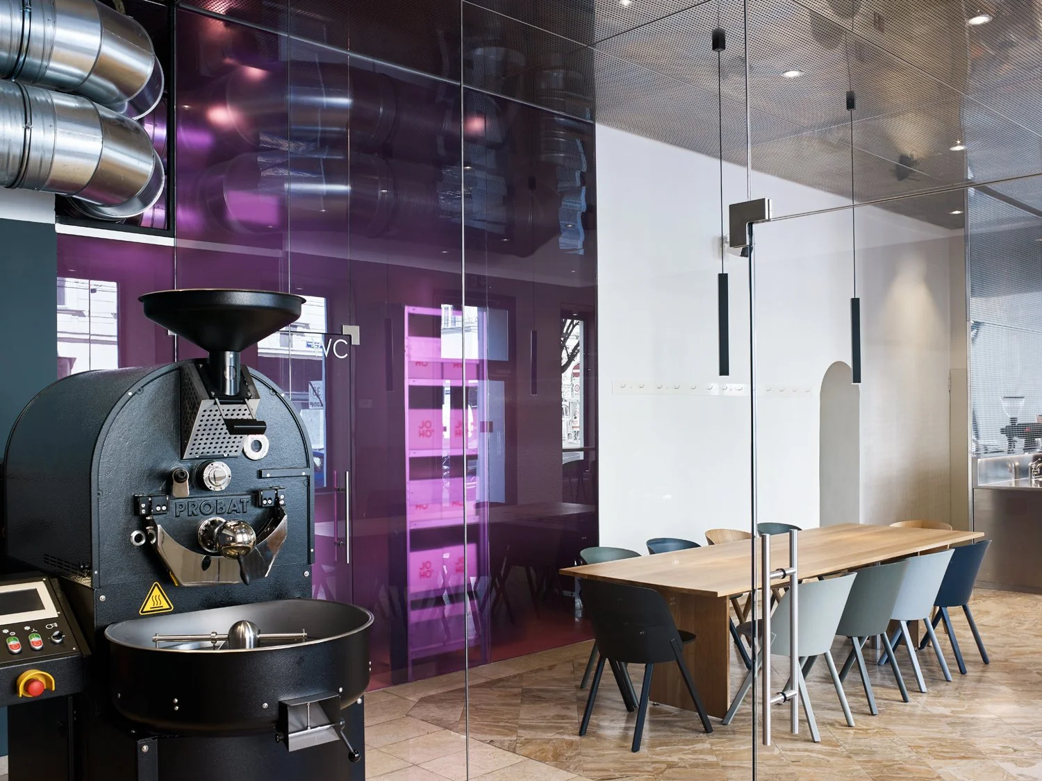 The design for J. Hornig's flagship store in Vienna was won in a closed completion. The original competition brief was site-less as the client had yet to find an exact location for the store. The initial designs were thus prototypical and experimental by nature. As a result, this early design phase afforded us an unusually close working relationship with the client as we fine-tuned our ideas. The flagship store would have to be a special kind of hybrid, part store, part roastery, part living room. It would have to function simultaneously as a neighborhood coffee shop and a flagship store for the company’s various brands and products. It would have to respond to Vienna’s rich coffee culture but also challenge it with something new. The space was formerly a Konditorei with fluted columns as room dividers, wood paneling and travertine stone floor tiles. We salvaged the worn travertine floor and sections of the wood paneling. Traces of the old space provided us with an opportunity for contrast. New elements are marked by a soft color palette of white, gray, pink, and beige. The softness in tone is applied on industrial materials creating a tension between warm colors and cold surfaces, between soft lines and hard forms. Raw oak, glass, white powder-coated steel, and perforated polished stainless steel maintain strict geometries. The space is divided into three zones, each reflecting programmatic shifts from fast to slow areas. The entrance area, oriented towards the street, is a fast space and features old wood paneling now painted in a neutral white. The middle section is fashioned as a living room with a variety of seating options. The back area is a slow zone, divided from the rest of the space by a glass wall behind which stands an industrial coffee roaster. A dropped ceiling of perforated polished stainless steel panels connects the three areas together, adding reflectivity and a play of light. A pink glass wall separates the main space from the bathrooms and the dry storage. The bathrooms are mechanical boxes clad in brushed stainless steel.