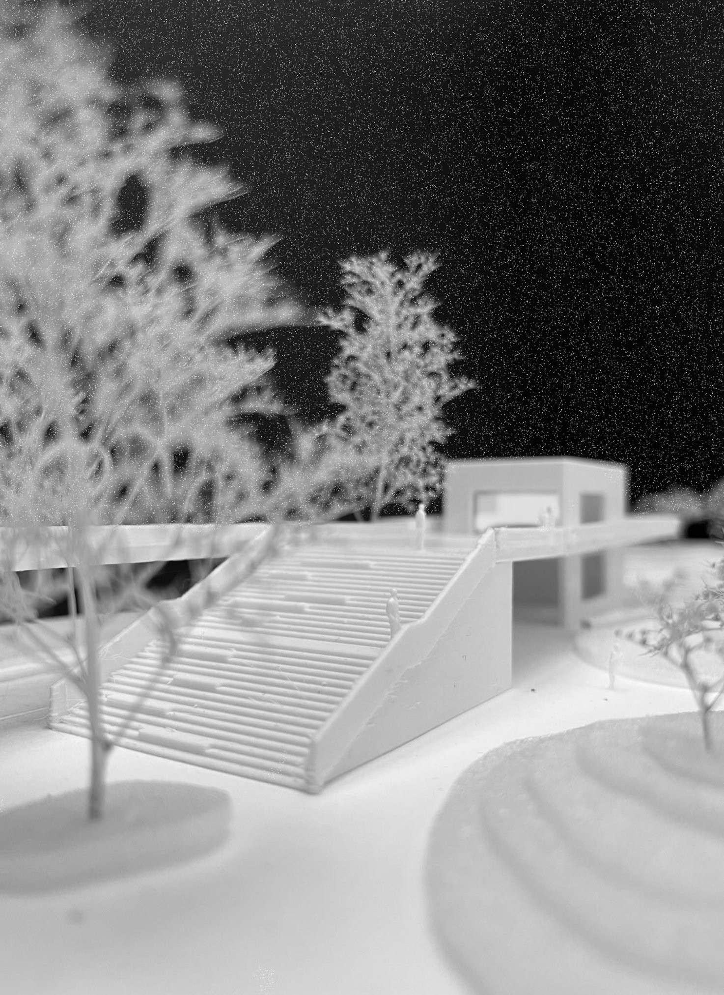 The competition brief called for proposals to rethink the future rest stops along the Austrian highway system, using the existing Roggendorf stop as a prototypical case. We devised a modular set of reconfigurable volumes based on simple geometric tiles that distribute the specified programmatic and environmental parameters in a variety of configurations. Besides integrating new functions such as drive-through gastronomy, automated services, photovoltaic surfaces, and an increase in parking areas, we thought it necessary to re-think the experience of pausing along the highway in more general terms. The design choreographs a radical transition in experience from the confines of a moving vehicle to the expansiveness of an elevated landscape that affords views of the rural Austrian countryside as well as the stream of fast-moving traffic along the highway. Between these two extremes are more insular experiences such as dining and play.