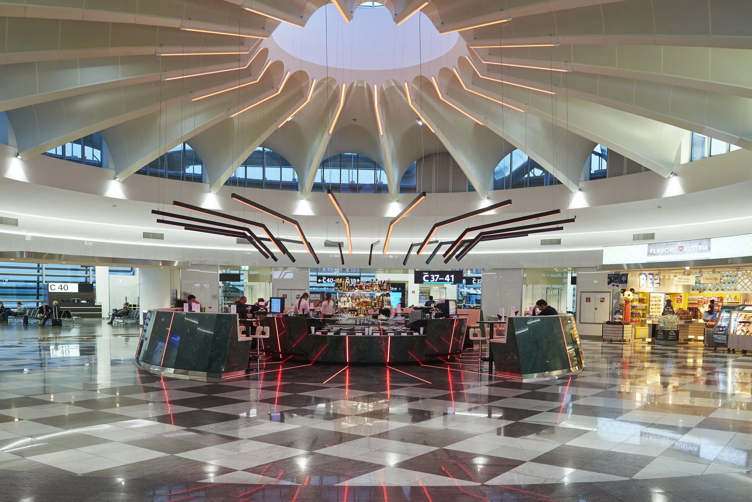 As part of a general renovation of Vienna International Airport’s Pier West Terminal, we were asked to program a circular area directly underneath a large rotunda from which a series of departure gates are arranged likes spokes on a wheel. The design makes use of the existing geometry, integrating the subdivisions of the rotunda in the partition of the structure and lighting concept.