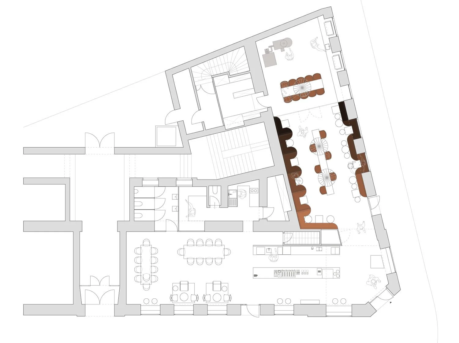 We drew and catalogued a series of traditional Viennese coffee houses and developed our plan based on an understanding of the typology. Low seating niches, a central spine of loose chairs and a table surface, and a band of high seats along the façade are all based on 19th century Viennese precedents.