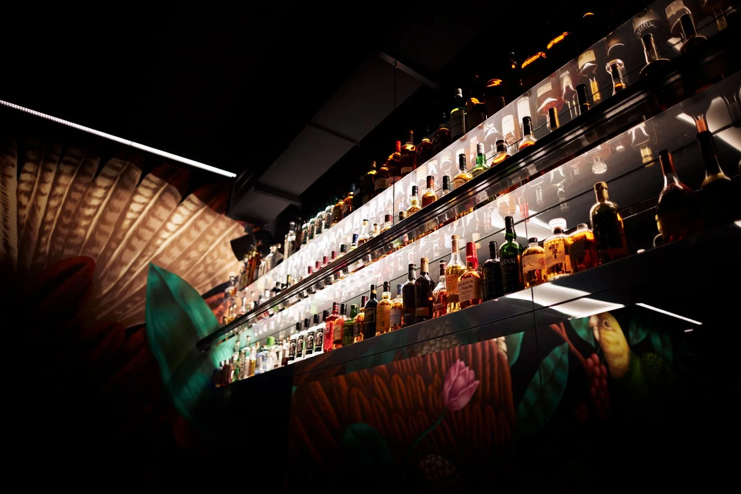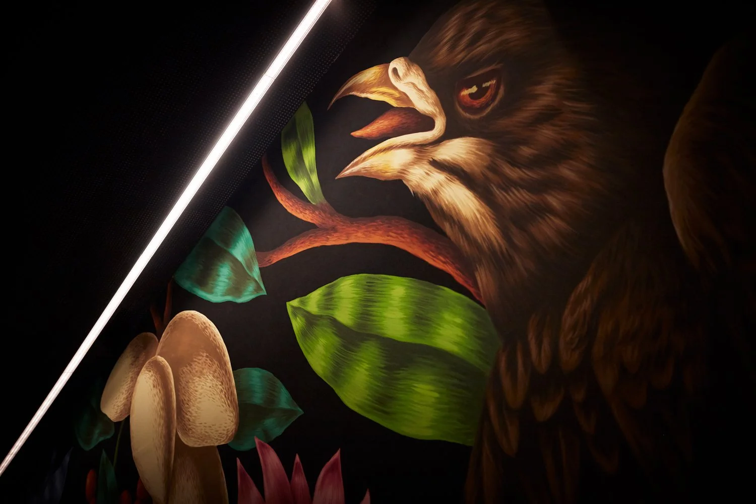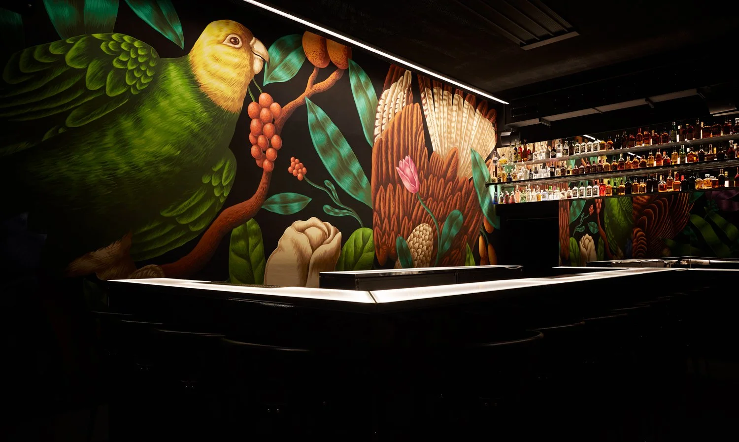 Spread between three floors, The Birdyard is based on a three-act spatial choreography that begins at the street. Floor to ceiling, hand painted murals depicting birds and foliage at a magnified scale create an immersive environment, an ant’s eye view of the world.