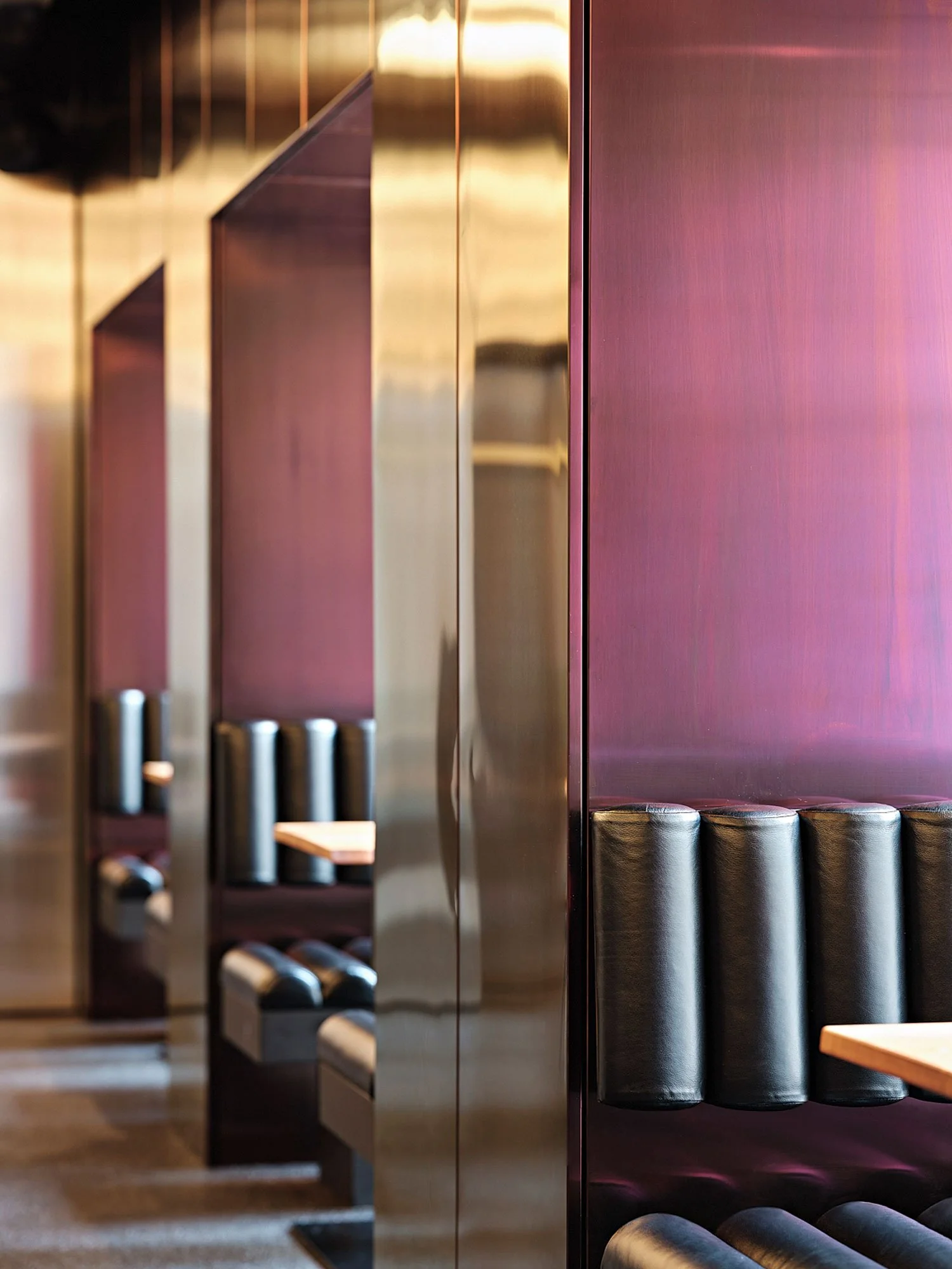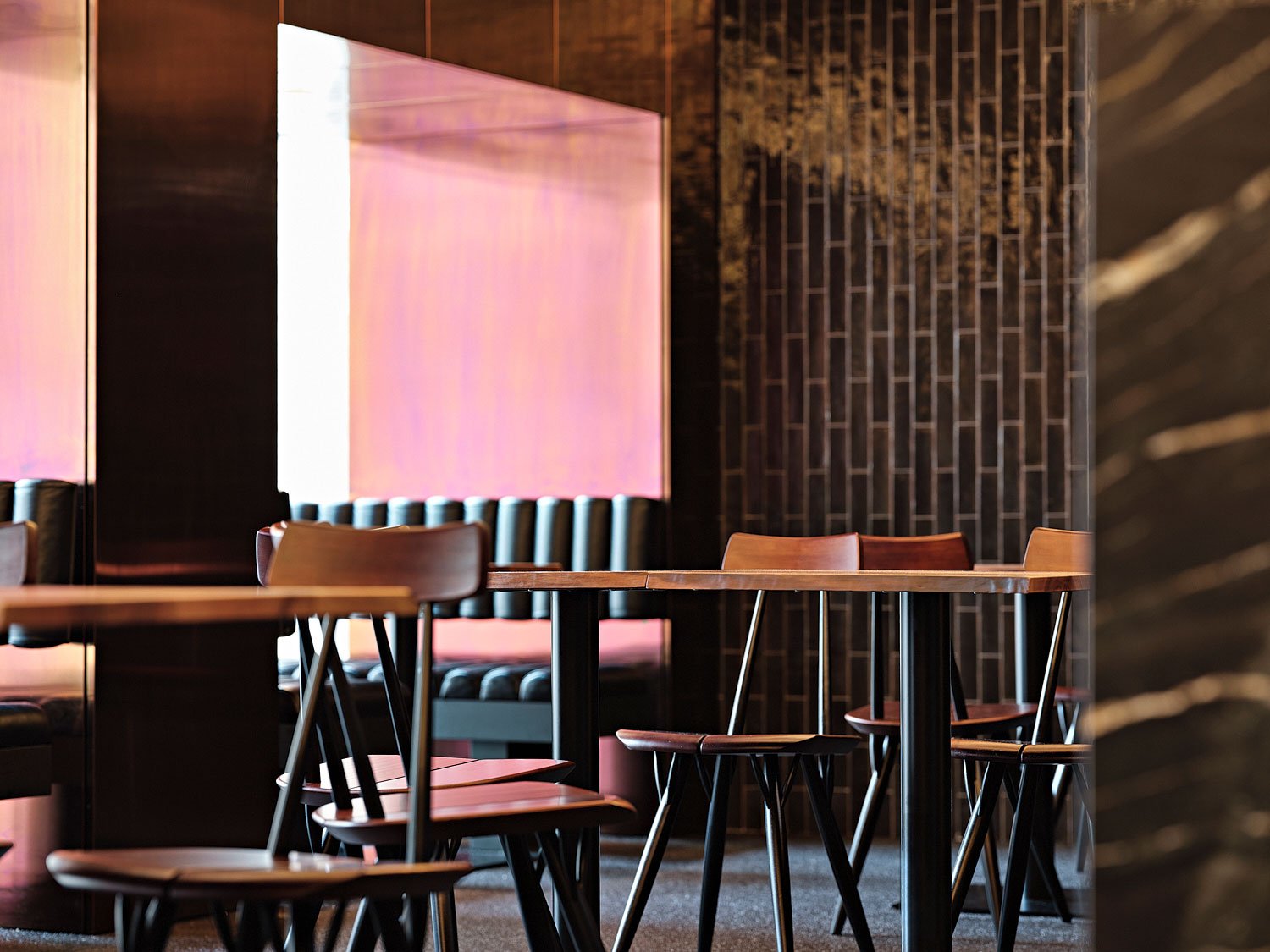 Tsuki is the second design iteration for a Japanese tapas restaurant in Vienna’s inner city. Unlike its predecessor which used material restraint, reminiscent of traditional wooden onsen interiors, this version does quite the opposite, taking its cue as much from fin de siecle opulence as it does from contemporary juxtapositions in color and texture. The interior is approached as a tableau of atmospheric scenes defined through the application of a rich material palette, one which at first glance may seem incongruous but through the experience of the space presents a clear sequence. The bar/entrance immediately shows three of the repeating material elements: various metallic panels, stone surfaces, and a horizontal chandelier made of walnut, steel, and small frosted glass tiles. The bar itself breaks from the material index as an anomalous block in pink corian. The kitchen and prep areas are concealed behind a brushed stainless steel wall. As you enter, a clear division is marked between the bar and the back stair and bathrooms. These back areas are coded in dark green mosaic tiles and green glass and stand apart from the main rooms along the facade. The stair leading up to the dining room curves around the primary structural wall, switching back to the floor above and is dominated by a vertical chandelier that uses the same material kit as the horizontal version on the ground floor. The main dining room is organized around a mirrored coffered ceiling where the vertical surfaces are lighted from behind and use the chandelier construction as a continuous ornamental accent, again repeating the underlying material theme of the project in a different shape. The same applies to the walls of the dining room. Each wall surface features a particular material, either repeated or newly introduced: brushed stainless steel, purple anodized aluminum, stained oak, black tiles. The floor is a black stone carpet, made of small dark pebbles, fused together with a coat of epoxy. Leather benches, walnut tables and chairs, and a granite service volume populate the space, adding further richness to the interplay of the surrounding material planes.