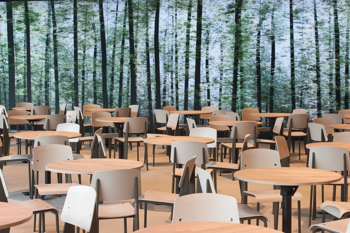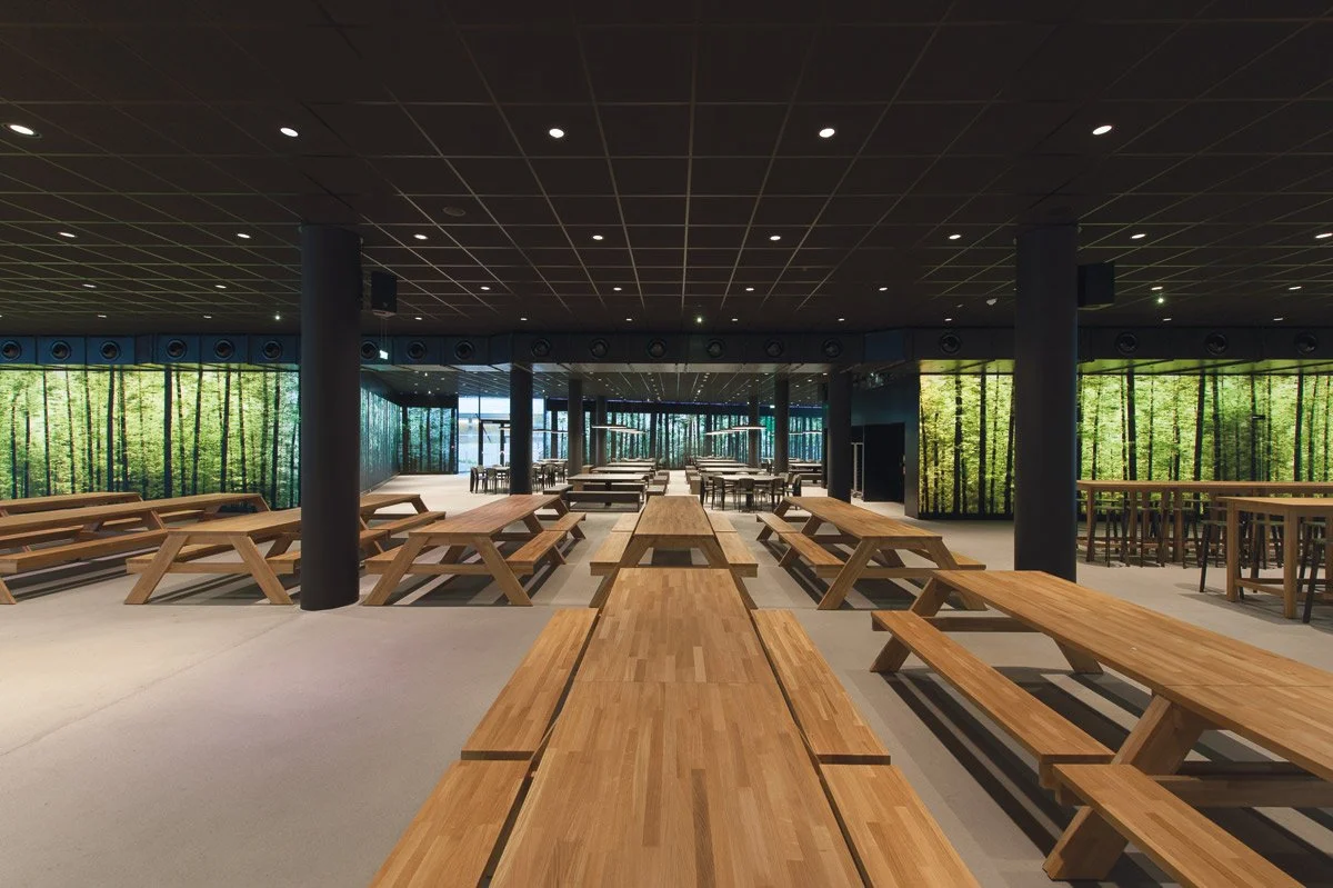The dining hall for the new Vienna University of Economics and Business occupies a large ground floor space in the Hörsaalzentrum. Although connected to the life of the campus, the Mensa reads as a separate environment, a place where students can find a break from their academic activities. To accentuate the break from the seminar room or lecture hall, the Mensa references the natural world outside the newly minted campus. Nature is interpreted as an opportunity to create the perception of environmental change. Nearly all of the opaque walls in the space are clad floor to ceiling in glass panels with a printed panorama of an abstracted forest landscape. The panorama was commissioned to the Austrian artist Markus Leitsch, who rendered an image recognizable as a forest yet strangely suspended between graphic and realistic states. The glass panels are back-lighted with programmed LED strips that change in tone and intensity during the course of the day, reflecting changes in daylight and seasonal conditions. A student that enters the Mensa in the morning will encounter a different environment in the afternoon. To emphasize the light qualities of the wall paneling, the ceiling, columns, and floor surfaces are black, gray, and unadorned. The dining area is divided in four zones, each characterized by a separate seating type that corresponds to particular uses and lighting conditions. All furnishing are made of solid wood stained in different tones. The meal stations, on the other hand, are all concentrated in a curved volume clad in anodized aluminum panels. The volume operates like a large market stall with each meal station having a separate opening. When the stations are not in use, large mechanical panels slide over the openings creating a taut metallic object. The Mensa is fully digitized and paperless. A digital payment system allows for a space that is absent of long lines and enclosed serving areas.