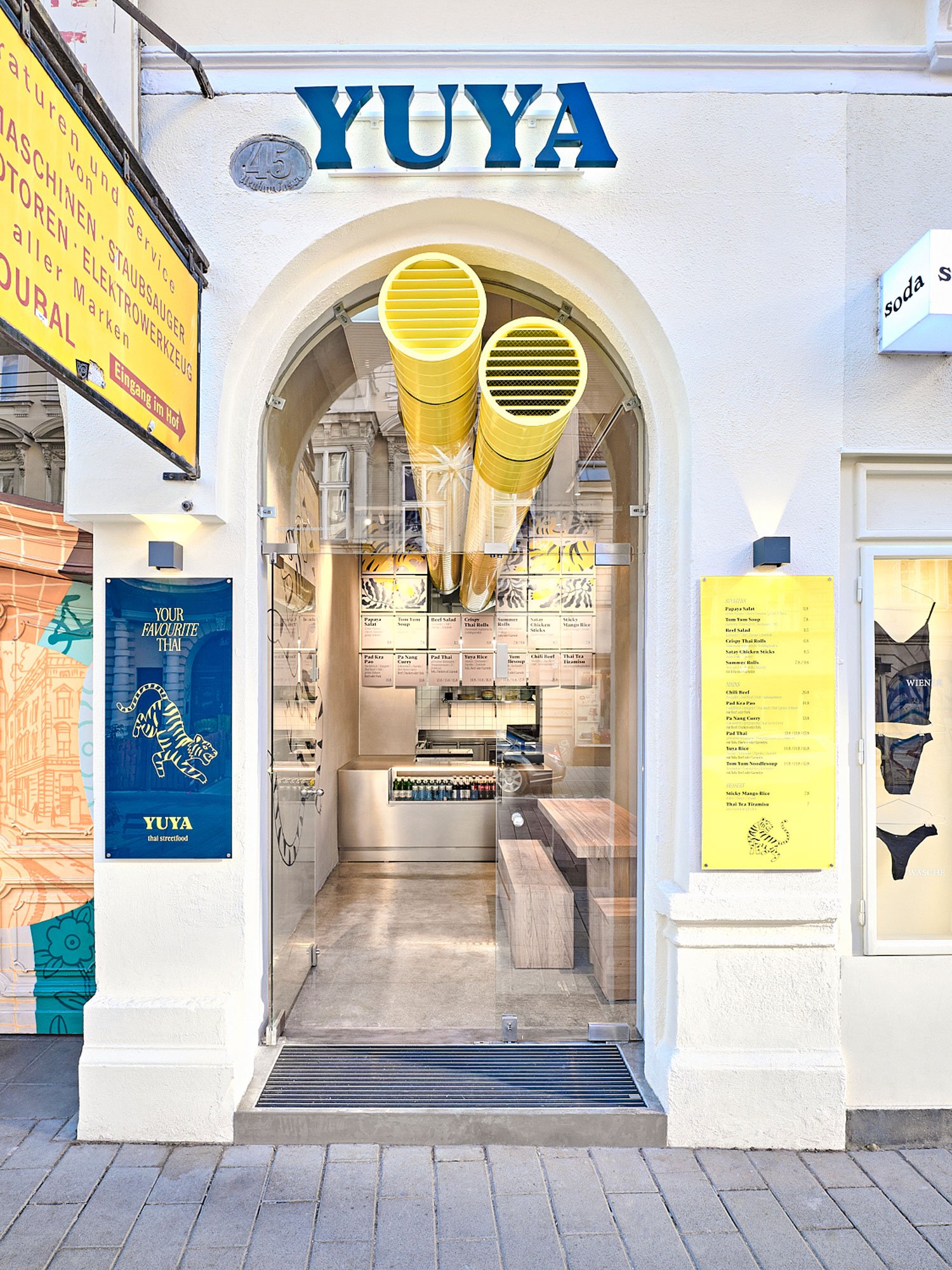 Yuya is a curbside cubby in Vienna's seventh district that specializes in Thai street food. When faced with a limited budget and an accelerated timeline, sometimes the pragmatic becomes the celebrated. Here, the new kitchen ductwork is presented as a colorful graphic element that pulls attention from the street into the small, narrow space, disappearing behind a plane of papers fixed in place by magnetic bars. The paper plane displays a current menu and wandering graphics of tigers in the brush.